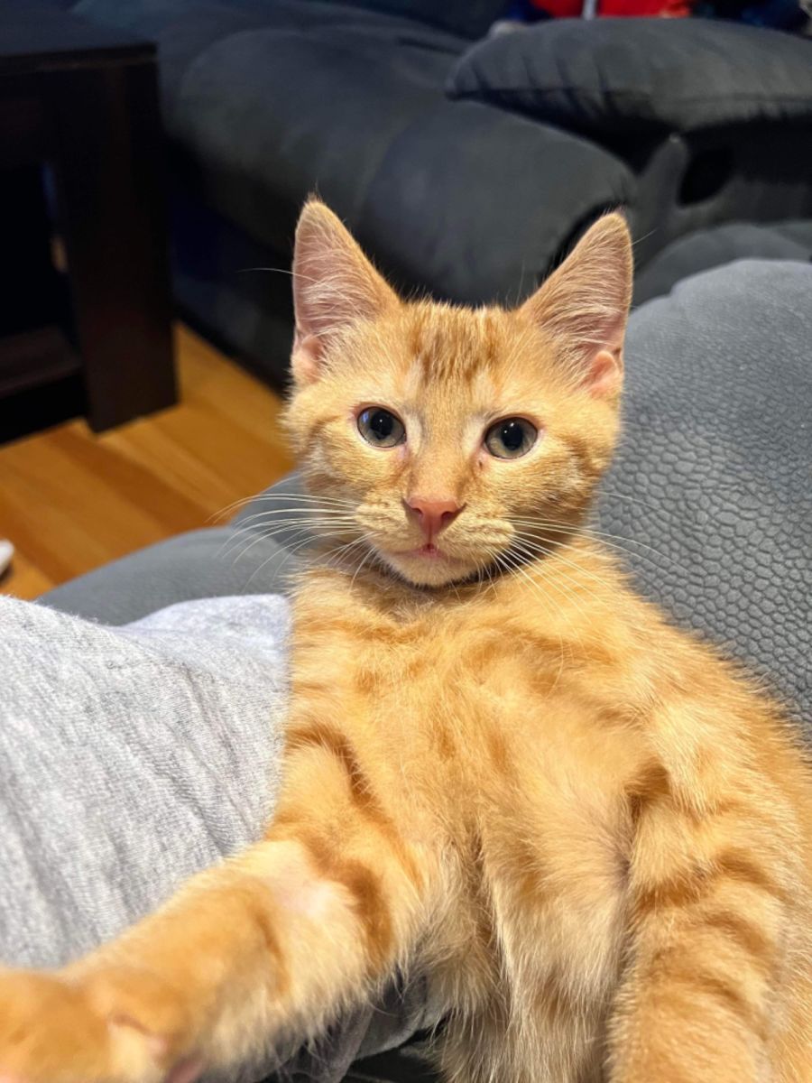 Little man is a very confident cheeky guy his not afraid of much, he will test the patience of other cats as he loves to pounce on swishy tails. Little man loves life, humans and food he is a very confident kitten and he rules the world the vacuum doesn’t phase this guy. Little man is great with his kitty litter and is just a beautiful gorgeous all round guy he is great with kids and loves to play with other cats. Little man hasn’t been near any dogs but will be fine with a cat friendly patient dog.