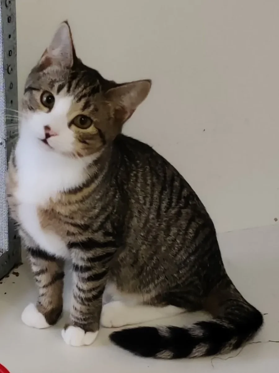 Cocoa is a brown tabby, 5 month old kitten who was found living on the street with his sister & 2 brothers.