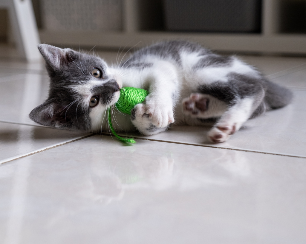 Pip is a grey and white little dude who just couldn't stop playing long enough for our AWL NSW Illawarra photographer to snap some photos of him. He was too keen to show off his excellent pounce, attack and bunny-kick skills with his mousy toy. Pip is very outgoing and confident. He loves playing with his brother, Asha, will happily join in play with the bigger resident cats in the foster home and is comfortable meeting new humans. Pip loves his toys and will chase them all over the house leaving a cute little trail of destruction behind him. He loves to explore all around the house as he is very inquisitive and curious by nature. While full of beans, he is also very sweet and loves his humans and some snuggly down time with them to charge his batteries for his next play session.