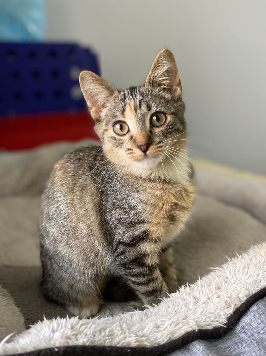 Evie is a gorgeous torbie girl with a fun and loving nature. She’s always looking for the next thing to investigate and play with and when she’s done she loves a cuddle. She loves being around others so she can get out all her energy, and gets along with other cats and the dog.