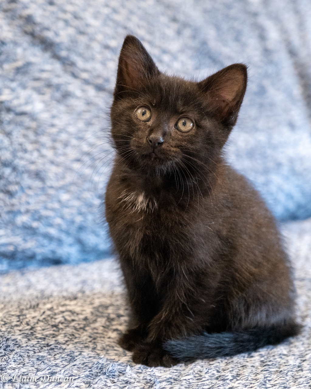 Olive is the smallest of her litter, but she totally holds her own! She is tenacious and determined, always keeping pace in the sibling wrestling matches, despite her size. However, she is also a total softie at heart. This petite sweetie just loves playing as much as possible when she is awake and adores cuddling and nestling into her human when tired for a snuggly snooze. You can spot Olive by her black coat and the sweet little white mark under her chin.