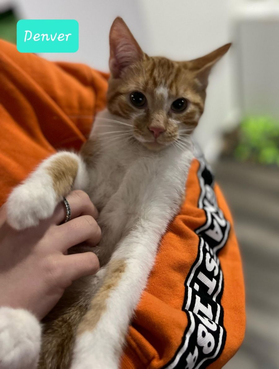 Denver loves a good play and then a snuggle. He is an active and playful kitten. Currently in foster care with his brother & sister, an adult cat and Izzy the terrier.