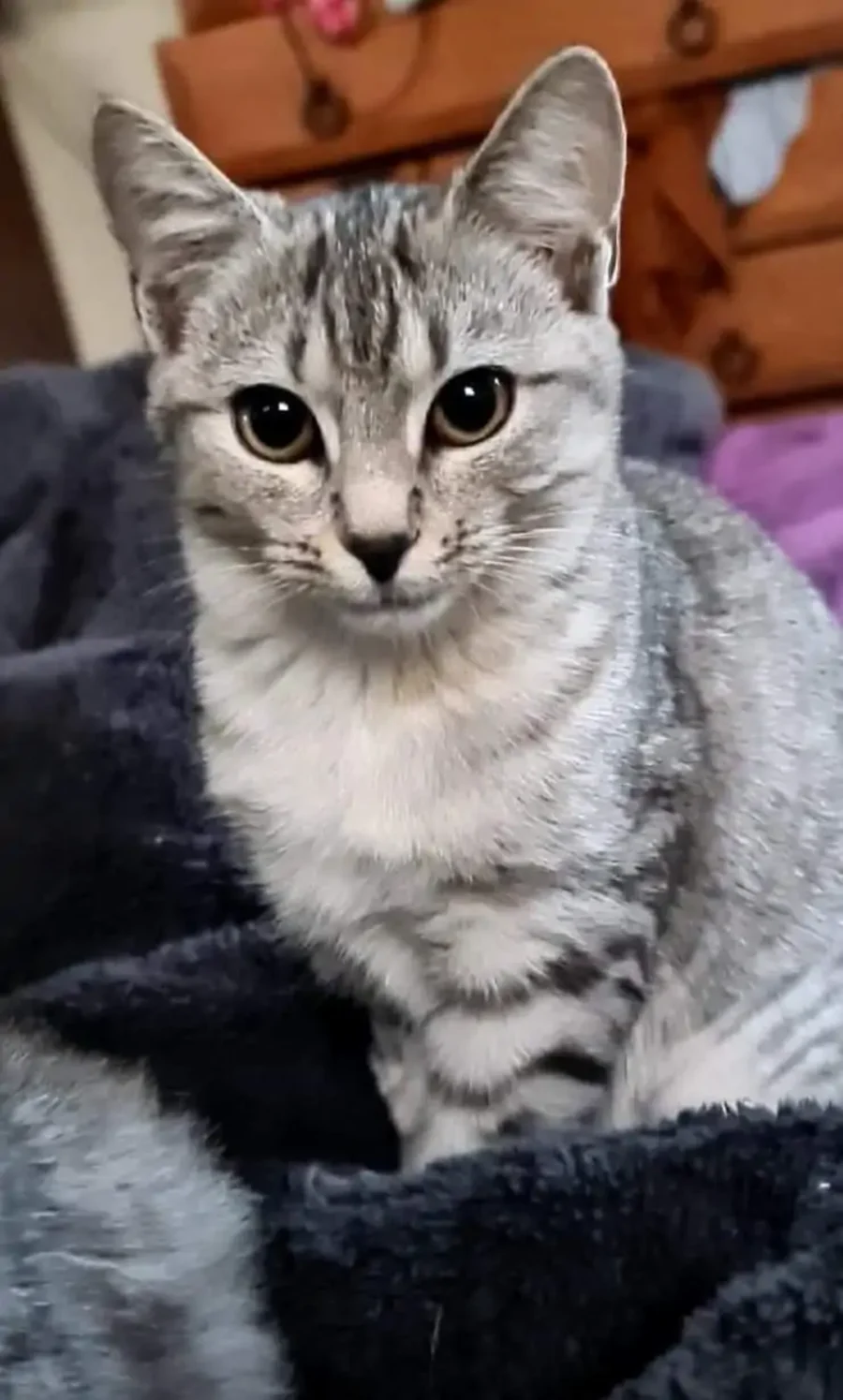 Snowy was named after a snow leopard because of the pattern of her beautiful silver tabby coat. She is a very responsive kitten and if you give her a little time to get used to you she shows her appreciation by purring constantly.