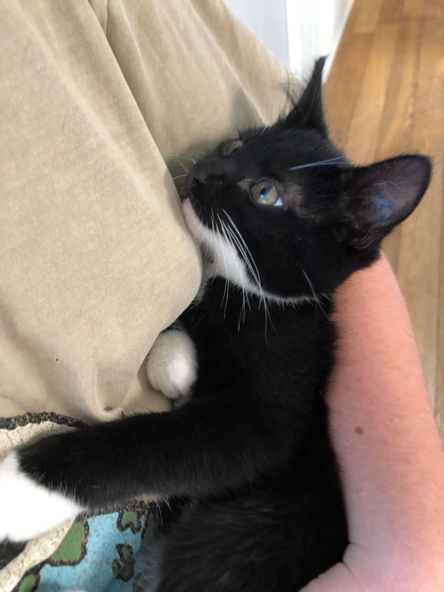 Mint and Thyme are a great pair, in that Thyme loves to be held and cuddled but is less likely to sit on your lap, whereas Mint is the opposite: he’s a busy kitten with little time for being cuddled but he loves to find you where you’re relaxing and settle in with you.