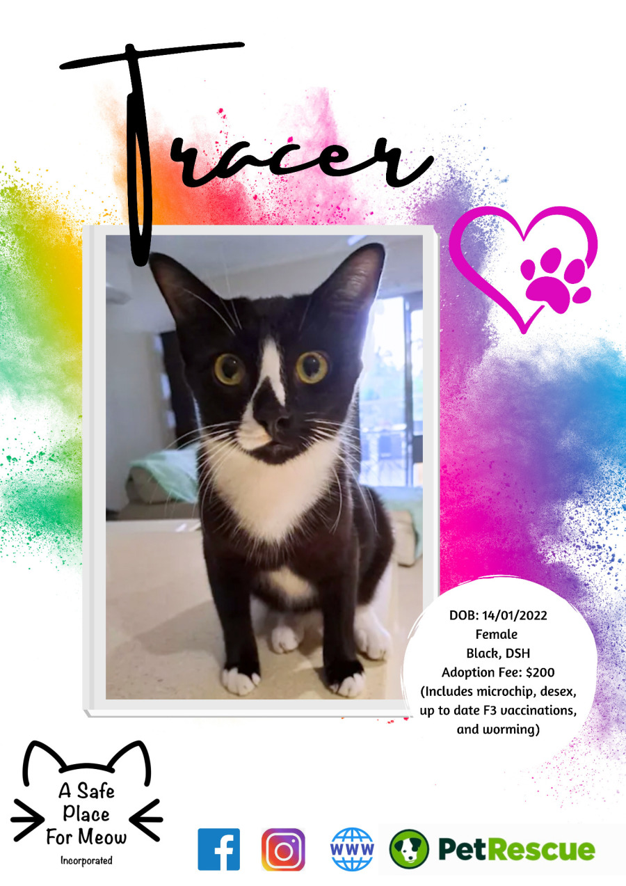 Tracer is a sweet girl who enjoys play time with her sister Echo. When she's not playing with her sister loves to snuggle with her foster mum. She is very timid and requires that special someone to give her time to feel safe.