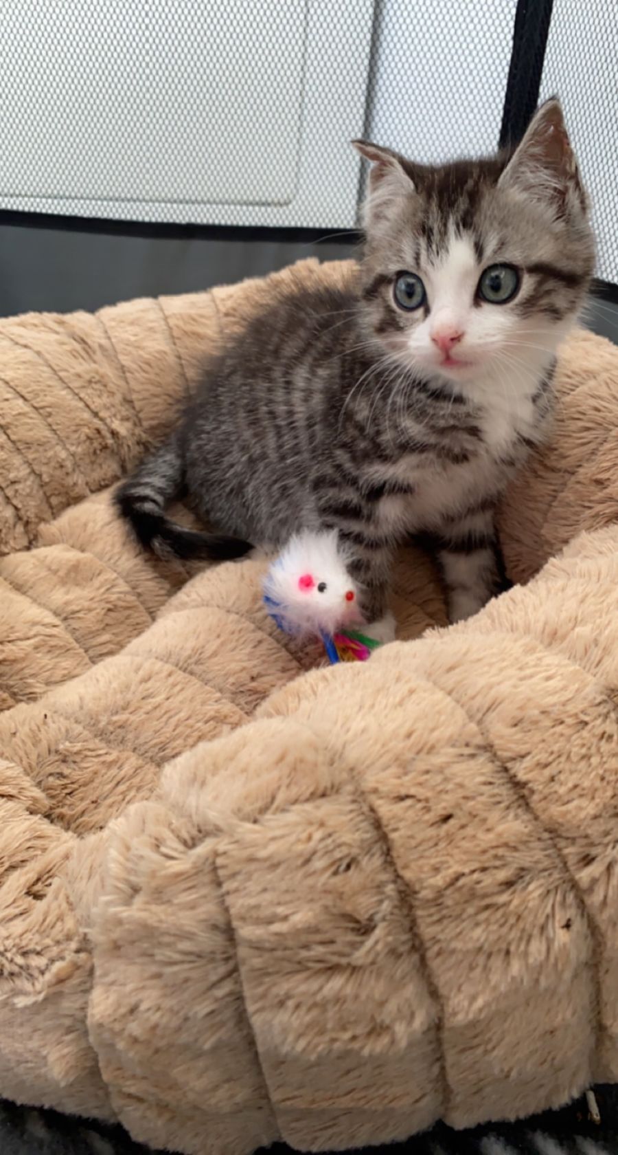 I am a playful 7 week-old kitty. I love to play with my toys and my humans. I also love to snuggle and cuddle with my humans đ