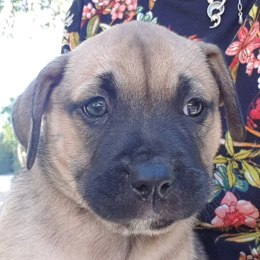 Joan of Arc is a typical, friendly puppy who loves everyone. She is a mix of breeds including staffy and mastiff, and will probably be a medium-to-large, stocky dog when fully grown. Don't forget, puppies are small and cute when they are young but they grow up!