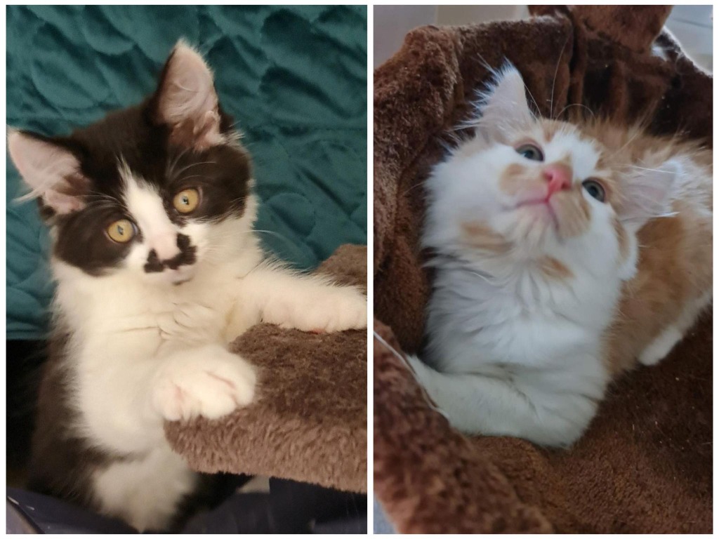 Cheesecake is a sweet floofy girl with the cutest mustache. She's adorable, sweet, friendly, cuddly, has the CUTEST squeaky meow and is very bonded with her brother Hokey Pokey. Hokey Pokey is a floofy stripey ginger & white boy who just loves everyone and everything, but always comes back to his sister to curl up and sleep together. While he absolutely loves cuddling his human friends, there's nothing he loves more than annoying his sister.