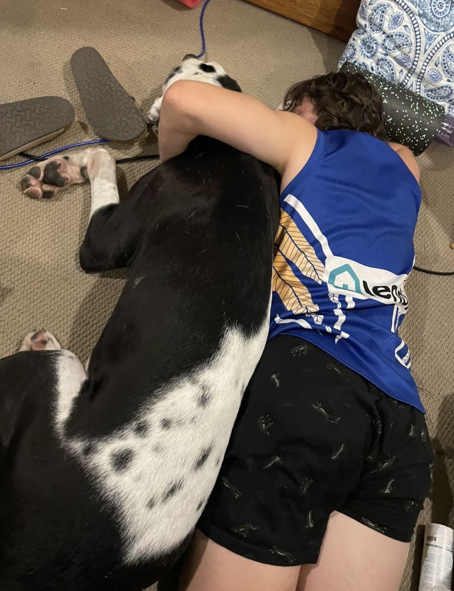Odin has learnt to stay on his bed inside, wait patiently at the gate of the fenced property for permission to come through and a number of useful basic commands. If he was allowed to, he’d follow you everywhere and yes even into the toilet. In typical Great Dane fashion, he’s a leaner when sharing the love and will break into Great Dane style zoomies out in the paddock! Fortunately, he seems to have an above average spatial awareness and manages to avoid crashing into innocent bystanders. He’s learned lots of lovely new manners recently however the paw will still often come up for attention. His on-lead walking has improved dramatically but still needs continued work. He loves to run and is doing well with his recall on the property so enjoying this newfound small freedom.