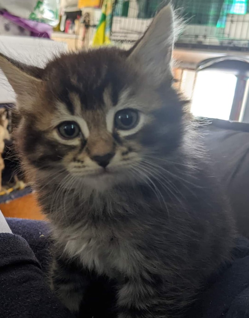 I'm George. Mum used to know who I was because I was the biggest kitten, then my twin sister caught up in size and now we like to confuse her. Pats and kisses are great.-