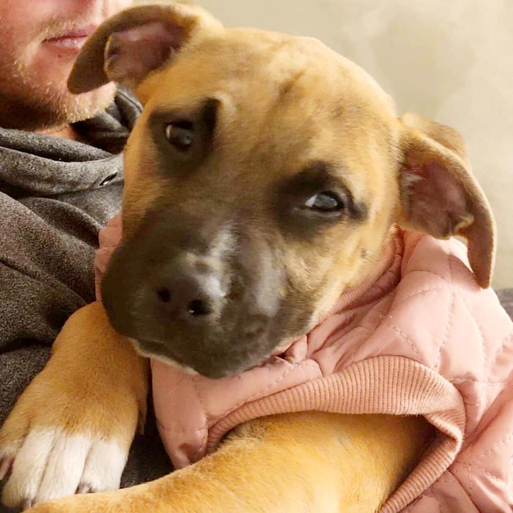 Little Penelope is a gorgeous, sweet girl who was found wandering on her own. Sadly no-one came forward to claim her so she finds herself looking for a loving family to belong to. She has grown a lot in two weeks in care, and put some good weight on. She is a mix of breeds but probably has some Staffy in her, and she will most likely be on the large side when adult.