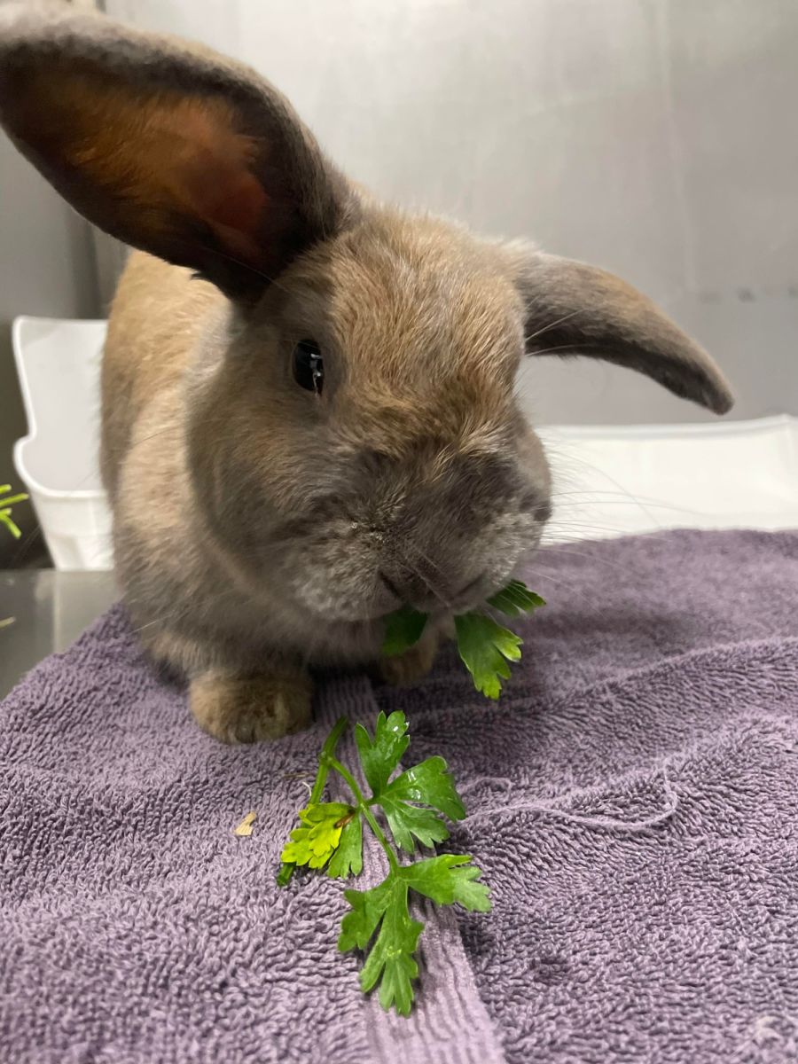 Bonnie has a huge appetite and will never stop eating hay, she enjoys her veggies, treats and will eat anything and everything given to her, but given that she will also want what you are eating too, so be sure no people food where she can get it. Rabbits are not designed to eat human foods, no matter how much they beg you for them! 😅