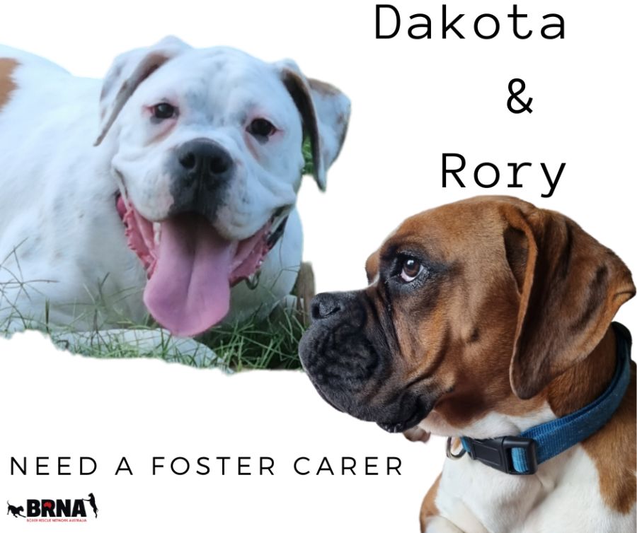 Dakota and Rory are a loveable bonded pair who enjoy playing and running about in the sunshine and just generally being good boys and girls! Dakota in particular has been known to use those boxer boings to jump over fences, so we are seeking a home with a good sized back yard and 6 ft fences. Rory gets very anxious when he does not know where Dakota is.
