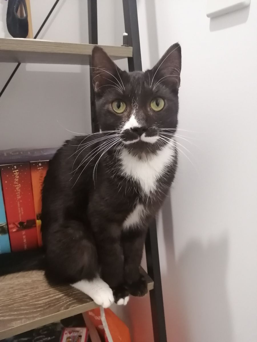 Meatball is a handsome 10 month old boy who is black with the exception of a few adorablely placed white patches (including his mis matched moustache)
