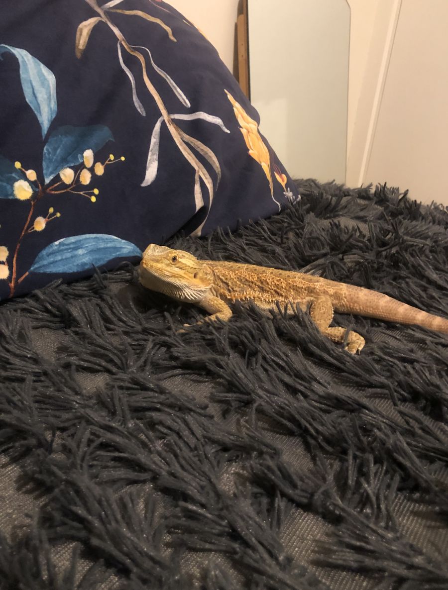 Meet cool dude Kip, the bearded dragon! Kip is very sweet, funny and curious. He's happy to lay around on your shoulder or tummy and watch videos with you - the ultimate best friend. Sometimes he gets the zoomies and becomes a speed racer on beds and floors. It's guaranteed to provide lots of laughs!