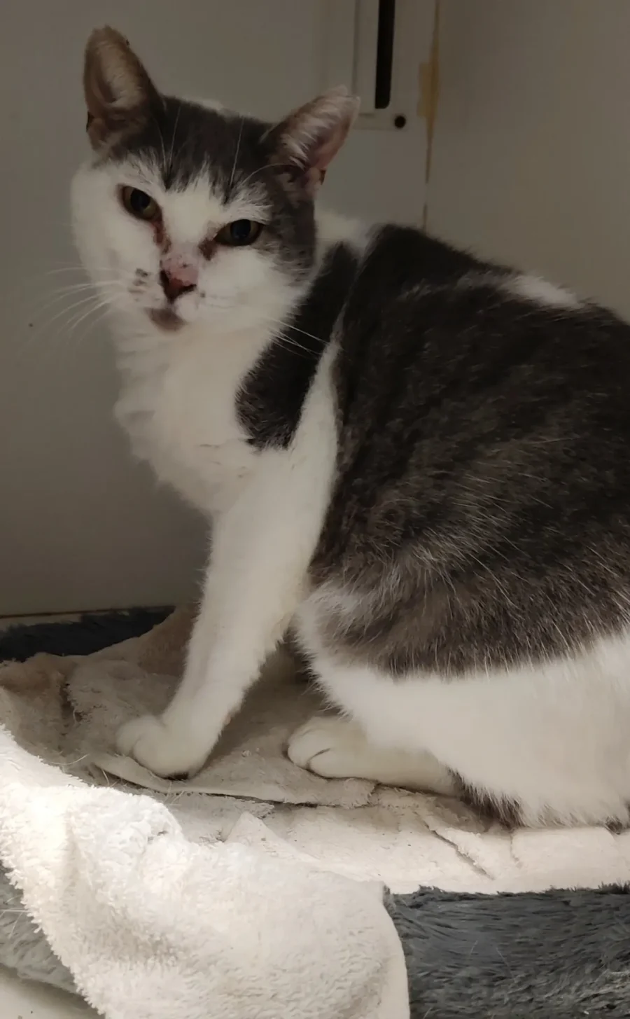 She is a beautiful grey and white cat who must have previously lived with people because she is so friendly & relaxed around them.