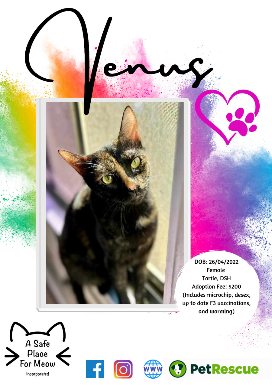 Venus adores being your sidekick. She'll grace you with her presence, sitting elegantly beside you, welcoming pats with a content purr, although prefers maintaining her own space and isn't a fan of being held or perched upon laps. With a regal demeanor and a love for autonomy, Venus is the purrsonification of charm and boundaries.