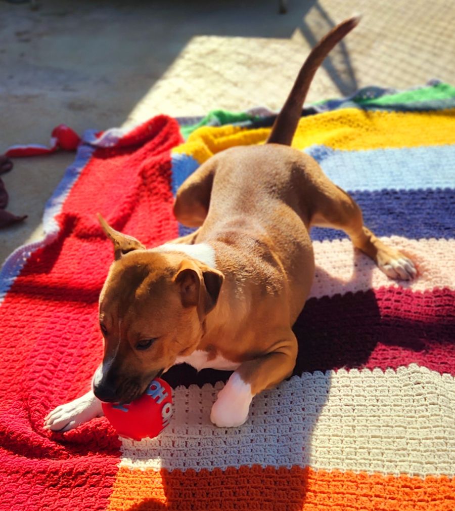 Ollie is happy and friendly and LOVES to play!! As you can see by his photos he is a bundle of joy.