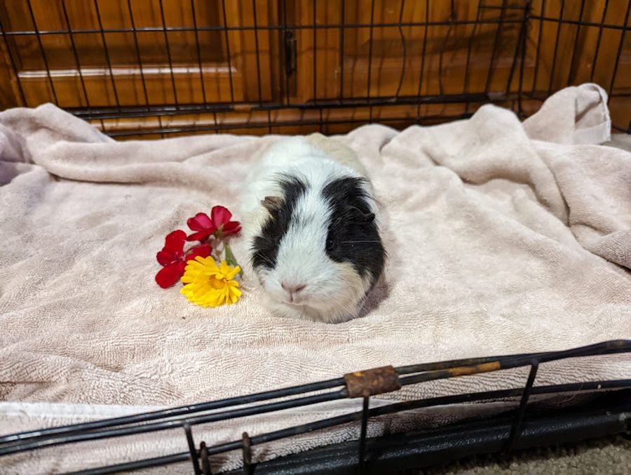 Girl, I’m high-spirited and will tell you what I want with my little squeaks. I’ll squeak when I see you coming with my food. I’m best described as gentle, independent, shy, food-orientated, affectionate and social with my fellow piggie friends. My favourite things are leafy greens, tunnels and my piggie friends.