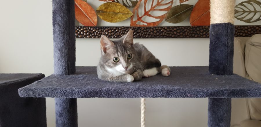 Smudge is a playful boy and enjoys and can't resist the dangly toys. He plays well not just with his litter mates but also with the resident cat. He would really enjoy a kitty friend in his new home but this would not be a deal breaker.