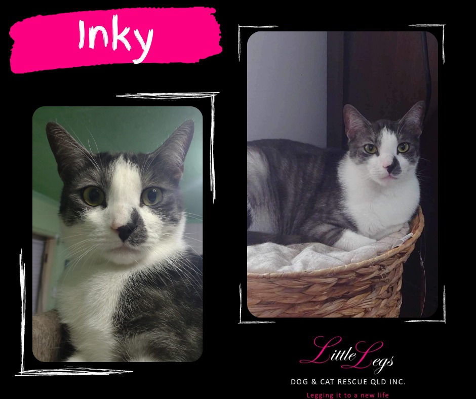 Hi, My name is Inky. Although I am only still quite young, a lot has already happened to me, and I am hoping my forever family is reading this, so I can finally settle down in my own home. My brother and I were found together in Mackay by power company employees as abandoned babies, and taken to the pound, where we were rescued by Little Legs from death row. We were very frightened of people at first, but we eventually started to trust them and relax.