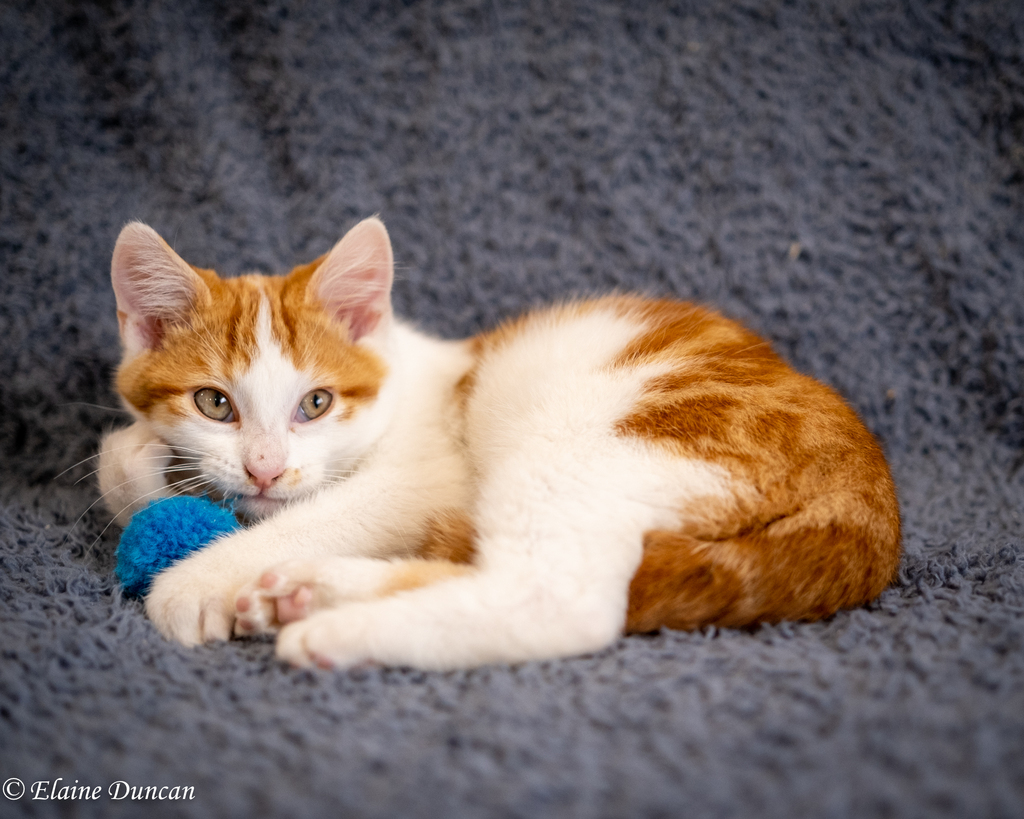 Finn is a stunning ginger and white boy with super soft coat with a tiny, adorable meow. Finn has come a long way from being a frightened baby to a very social, loving young man.