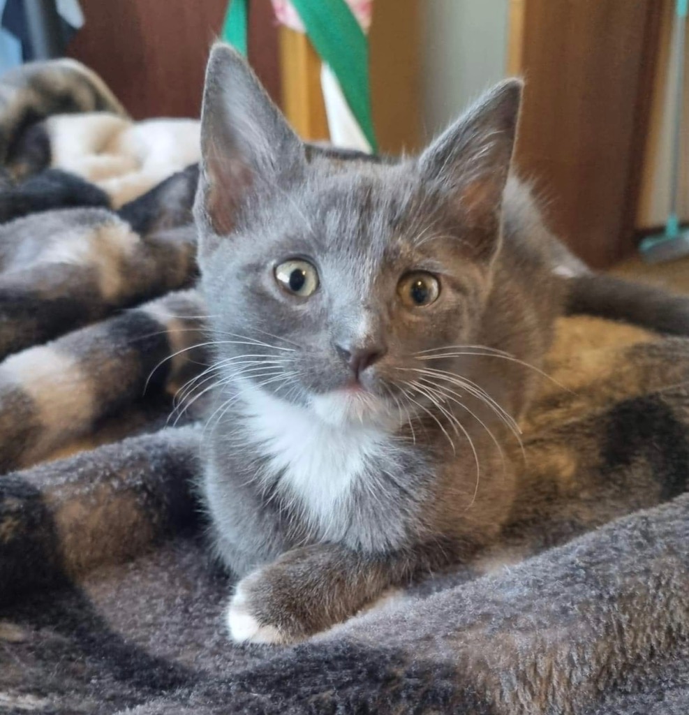 BraveHeart is the grey boy from a litter of 4 - the only boy from his tribe - described as loving and the more more smoochy of his litter mates. A popular grey colour who will grow into a handsome boy. Hand reared from 2 weeks of age - very people savvy and used to being handled. In a home with older felines and older children. Adoption to a home with a friendly feline or one of his siblings would be favourable.