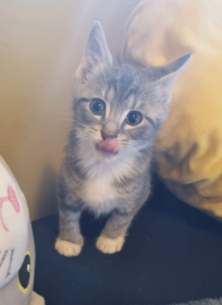 BrightHeart is a very pretty grey and white tabby female - described as shy and cheeky she likes to hide in the clothes cupboard with sister GentleHeart. A lovely grey kitten who has a white chest and socks to match - who will grow into a stunning adult cat. Hand reared from 2 weeks of age - despite being shown the same attention and love as her siblings, she does not like being handled and tends to dive into the bed cushions and blankets. In a home with older felines and older children. Adoption to a home with a friendly feline or one of her siblings would be favour to help boost her confidence.