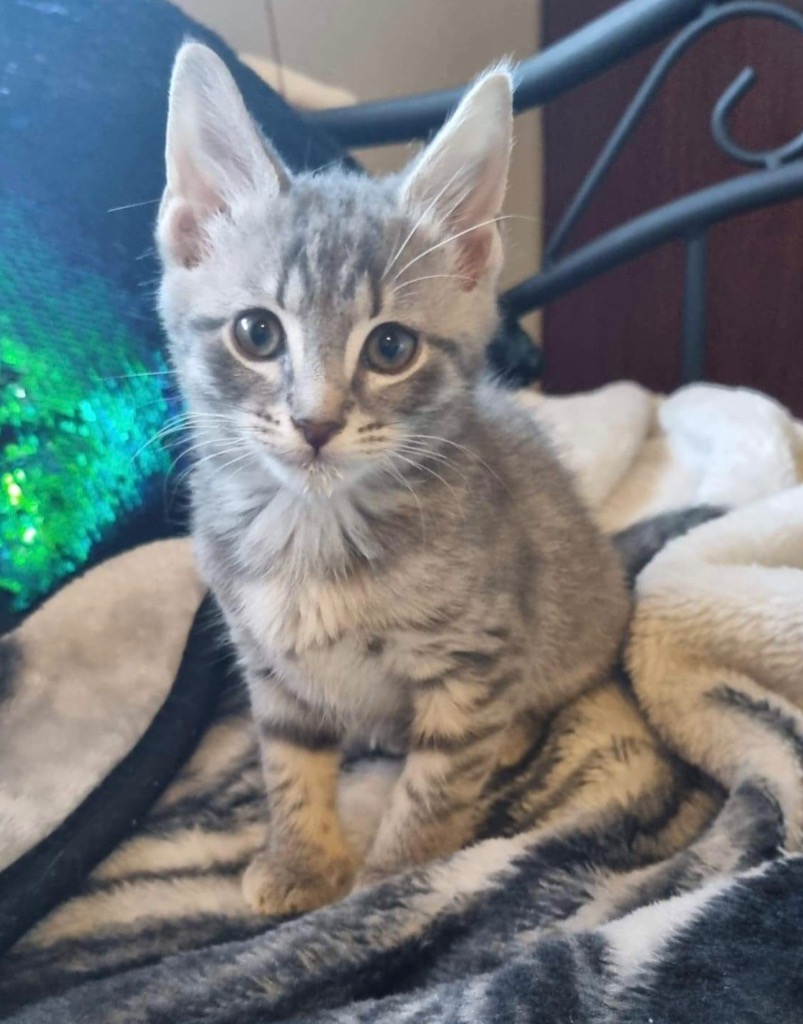 ProudHeart is a pretty all grey tabby female - described as the more loving and confident of the 3 females and great buddies with brother Braveheart. A popular grey colour who will grow into a stunning adult cat. Hand reared from 2 weeks of age - very people savvy and used to being handled. In a home with older felines and older children. Adoption to a home with a friendly feline or one of her siblings would be favourable.