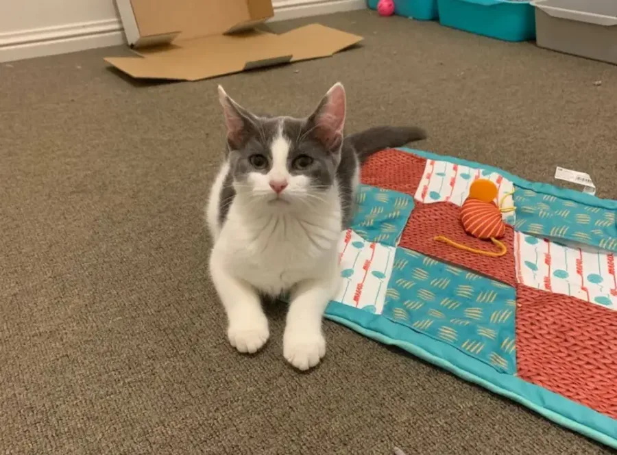 Sugar, spice, and everything nice! These were the ingredients chosen to create the perfect little kitty. Professor Utonium mixed the perfect concoction to create beautiful Bubbles. Bubbles might be the most cuddly kitten you ever come across – she is frequently following her foster humans around to see what they’re upto and constantly reaching up on her back legs for a head nuzzle. The second she walks into a room, Bubbles has her purrs rumbling away. Bubbles also loves to play chasey with her toy mouse, and even carries it back to her bed for safe keeping.