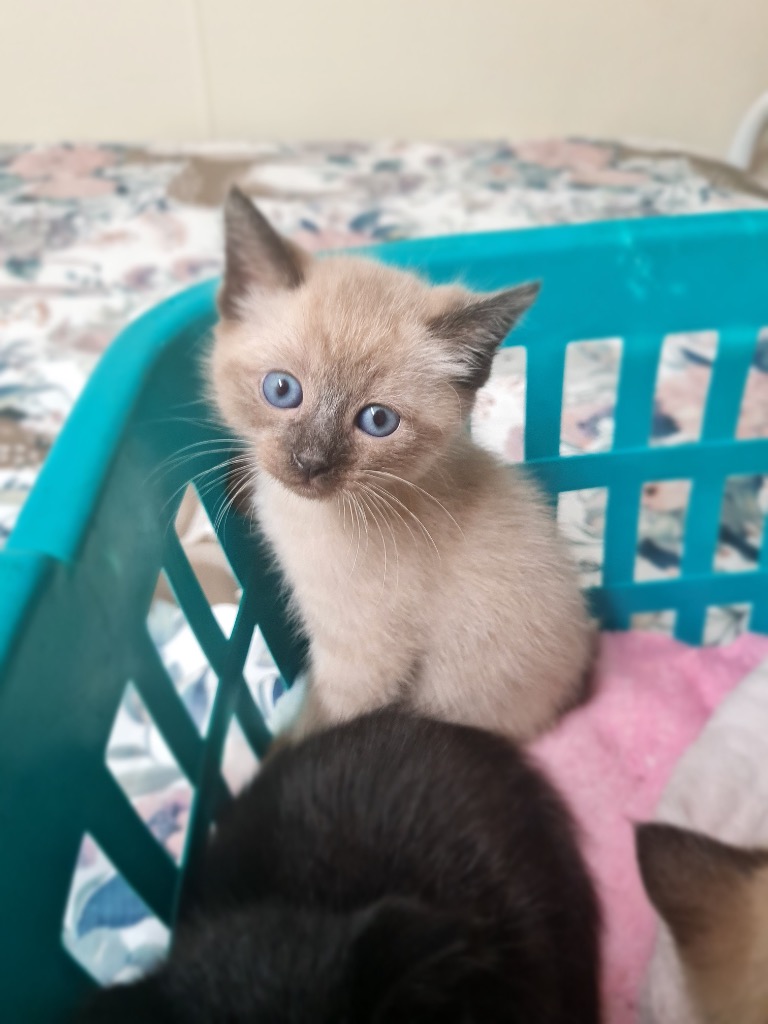 Meet our new litter of 4 who have come to SAFE with their stunning mumma Tayla. High energy, mischievous, curious, and good looking kittens - learning to master the litter trays. In care with adult foster cat Sinatra, these kittens are regularly handled by their carer and her son. They are some type of oriental cross - not purebred - but closely resemble chocolate/seal point Birmans without the overly fluffy coat. These guys are short-medium haired - mum is a black, medium hair domestic. Adoption with a sibling or with mum would be ideal.