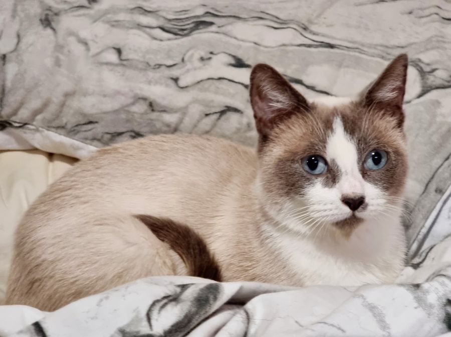 ➡️ I am a petite and young snowshoe cross. My foster mum says I have the prettiest baby blue eyes. 🐈⬛ I am friends with the other cats here. We all love to play and take turns chasing the hanging star. There are dogs here too...that I have to tolerate. I mean, we share the bed each night no worries, but if they get all over-excited and jumpy, I tell them to *&^% off, gently of course, I'm a lady.
