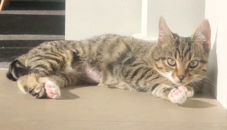 Tabitha goes to her new home desexed, vaccinated, microchipped and regularly parasite treated. Tabitha was attacked be another animal and suffered several puncture wounds. One of these was below her ear and caused some temporary nerve damage, causing a small amount of paralysis on one side of her face. This also caused her eyes to blink independently of each other, but this also seems to have rectified. Tabitha is now a healthy, happy little kitten, but there is still occasionally evidence of the nerve injury in her eye movements.