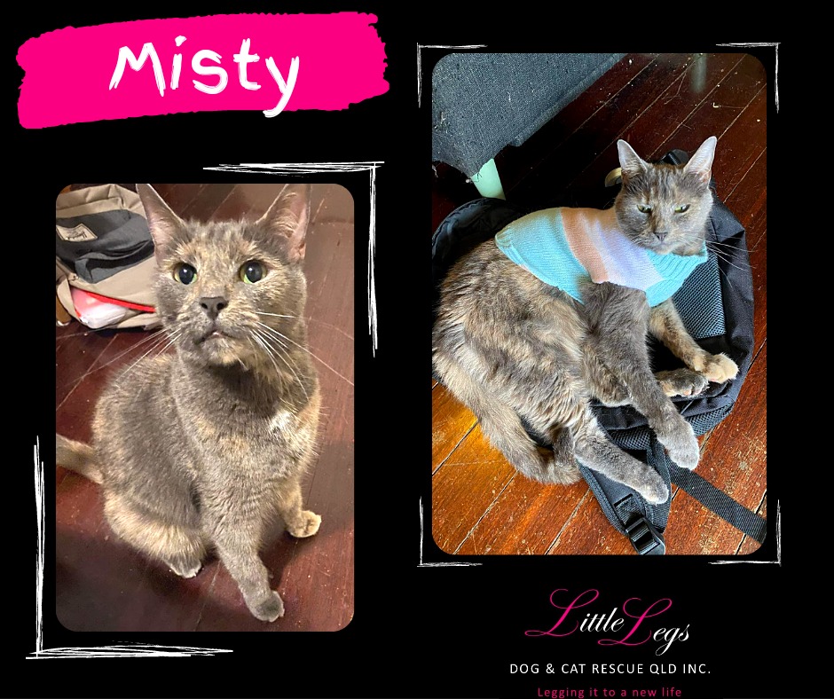 Misty is beautiful on the inside and outside. A dilute tortoiseshell; Misty likes to sleep most of the day in the same comfortable spots. She is very relaxed and has never shown any aggression towards humans and will occasionally hiss at other cats. Misty loves treats of all kinds and will enjoy a meal with her human. Misty is a professional biscuit maker and will knead any blankets she will come across. Misty loves pats but doesn't like to be picked up and will meow to be let down.