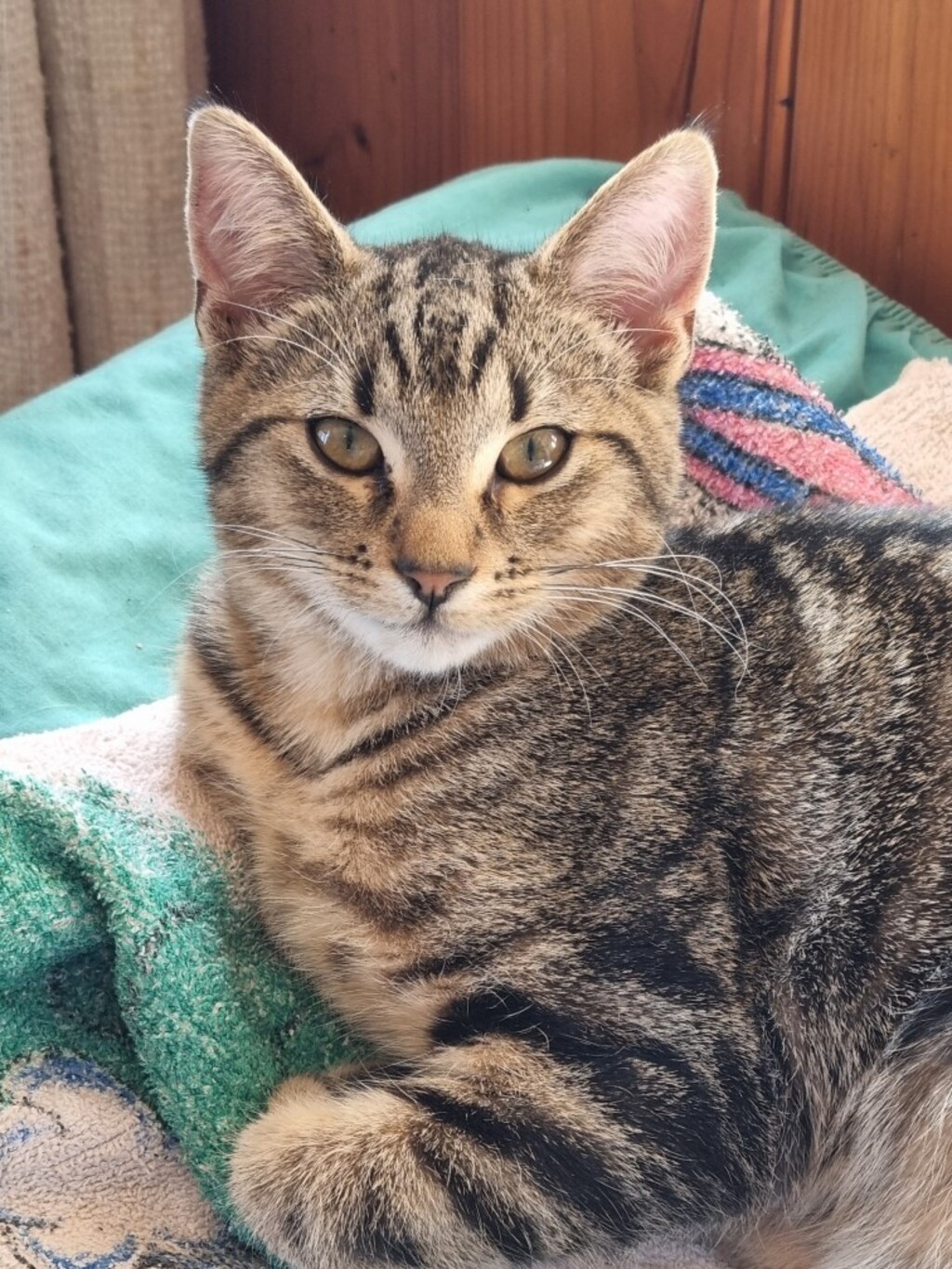 Milo, a handsome brown tabby kitten, is a gem. When we first saw Milo and his sister Minnie at the Council Shelter, along with so many other kittens and cats, we were immediately drawn to these two and we knew we needed to take them into care. They have proved to be all round great little kittens and highly recommended for adoption.
