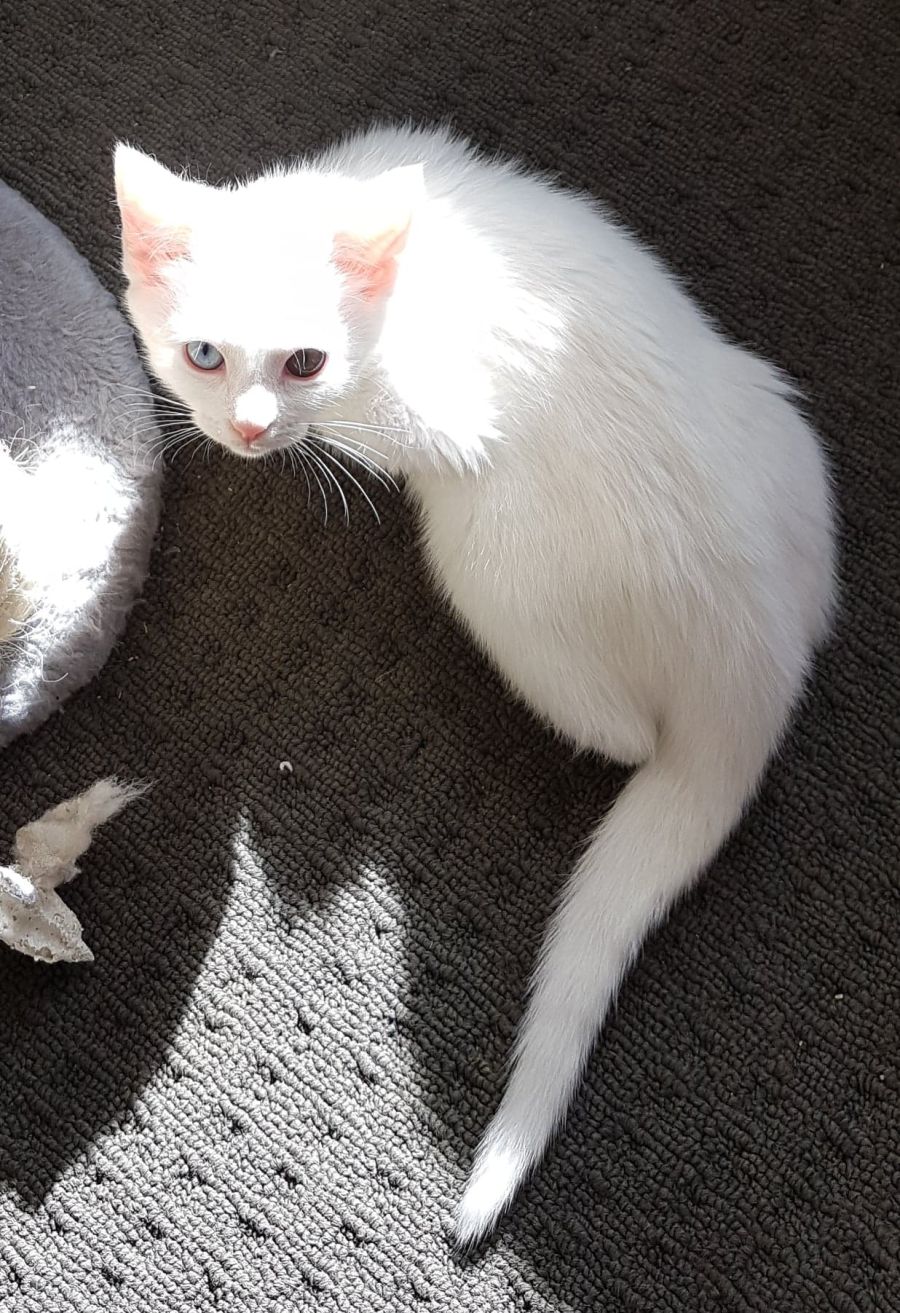 Nusty is a gorgeous white girl with two-toned eyes! She's an affectionate, outgoing girl who loves her food! She loves playing with toys and her siblings and her foster carer's grandchildren. she'd be best suited to a family who can give her lots of attention.