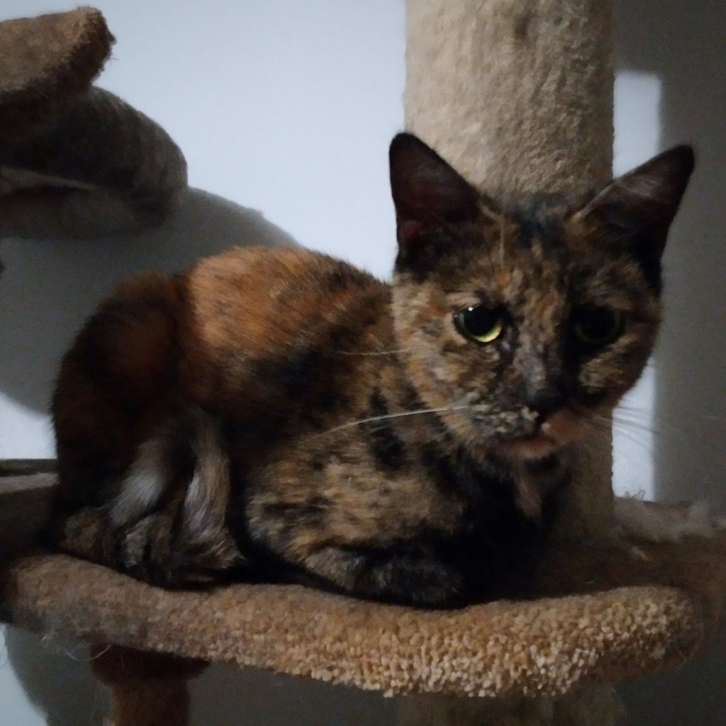 This sweet little girl is Mindy. Mindy came into care quite shy but with lot of TLC and gentle acceptance of her need for a settling in period, she has really come out of her shell and is a lovely, friendly kitty who follows her carer Dad around the house. She will now welcome strangers after 5 mins of sussing them out. She wasn't a huge fan of being picked up but she has improved and started enjoying being carried. She has always loved being pet and scratched, especially on her chin.