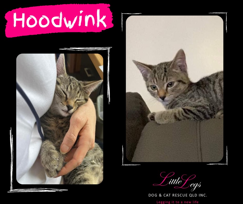 Hoodwink is the sweetest cat I've met! You just need to look at him and he'll purr at you! You can pick him up and ""squish"" him and he purrs at you. He'll reach up to you when you go to pick him up! His fur is so soft to touch and he loves his belly being rubbed. he wants to be near you so you'll regularly find him following you. He loves a lap to sit on or sitting beside you on the couch. Besides being super cuddly, he is so patient with the younger smaller kitten that play attacks him! He loves his food and also playing with his sisters. He would love a forever home with someone who will give him a lot of love and affection.