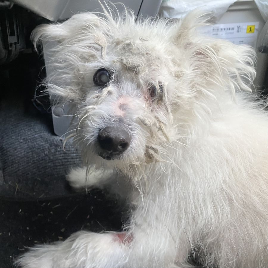 Oswald is blind (cataracts) and hearing impaired. When he came to us, he had been neglected for some time, severely matted with overgrown nails digging into his paw pads.