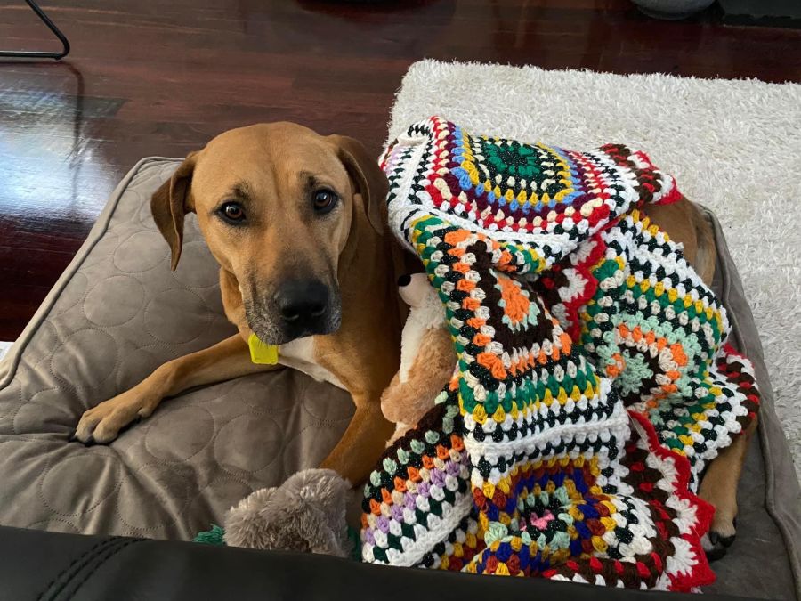 Once she’s had a chance to settle in & bond with you, she’s happy to stay home snoozing on the couch or her bed while you’re out, just leave the tv or radio on for her. A smart dog, she already knows cues like ‘sit', ‘wait’ (for her food), ‘lie down’, ‘on your bed', ‘off’, and ‘no’. And she’s currently working on ‘away’ and ‘leave it’.