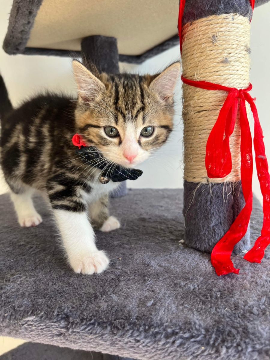 Since then, I have had regular flea, tick and worming treatments and have been fed a high quality Kitten specific food to support my growth and development. I have been in care with my foster mum for the last 6 weeks and in that time have learnt the ropes in all things house cat – climbing, jumping, playing, using a litter tray and interacting with a range of people. I have been kindly mentored by the 2 resident adult cats here who have been able to teach me about cat boundaries and behavior. My brothers and I are all well-handled and after some time to decompress in our new homes are showing excellent promise in being well adjusted, confident cats.