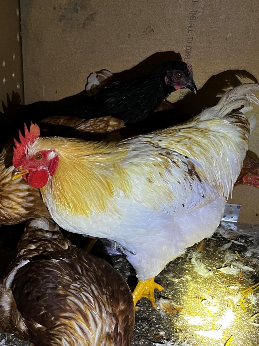 Popcorn, loves to be picked up and enjoys a cuddle or two, he is friendly with other chickens.