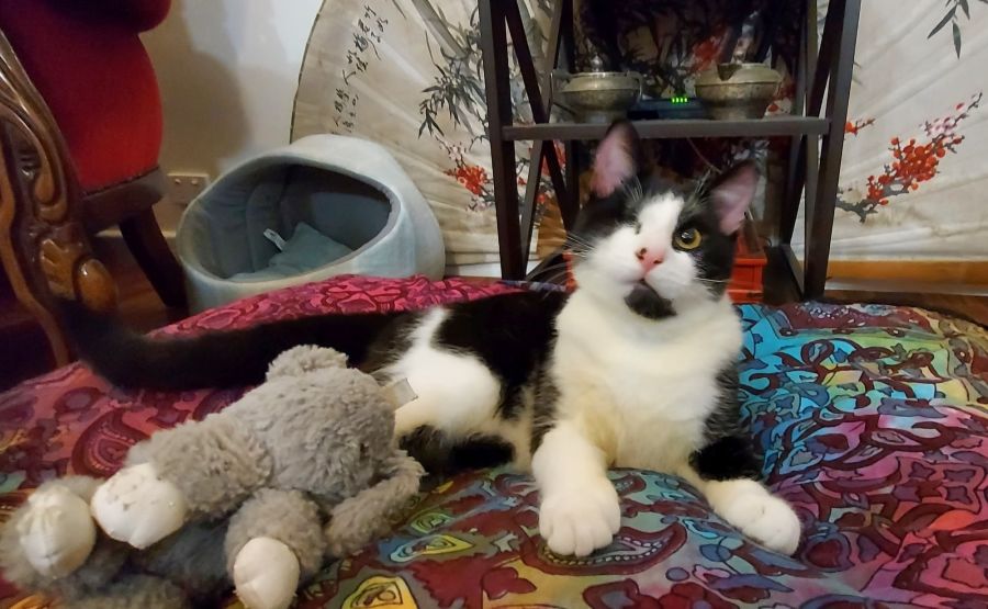 Firefly loves his toys and will use a scratching post. Due to his time on the streets as a young kitten, he absolutely loves his food so would need someone who has the discipline to not over-feed him with all of the treats!