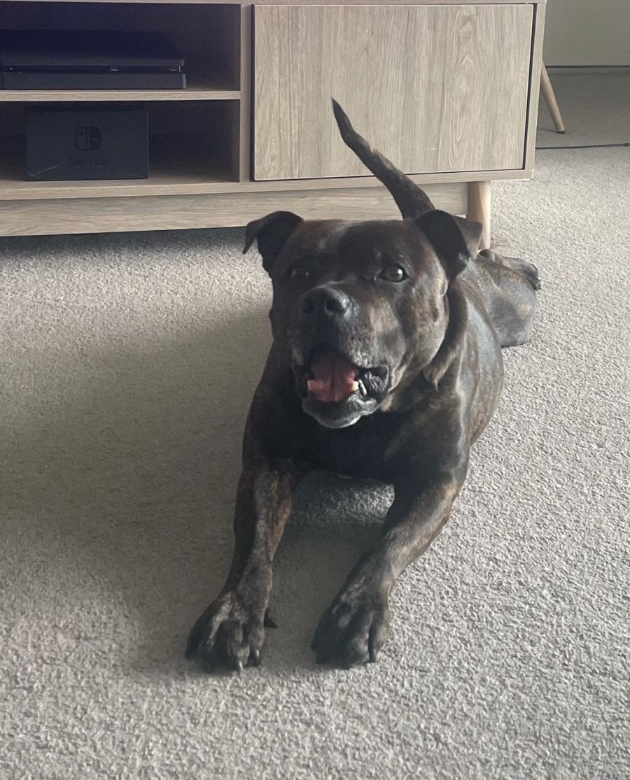 He is all staffy smiles, tail wags and just a big love bug.