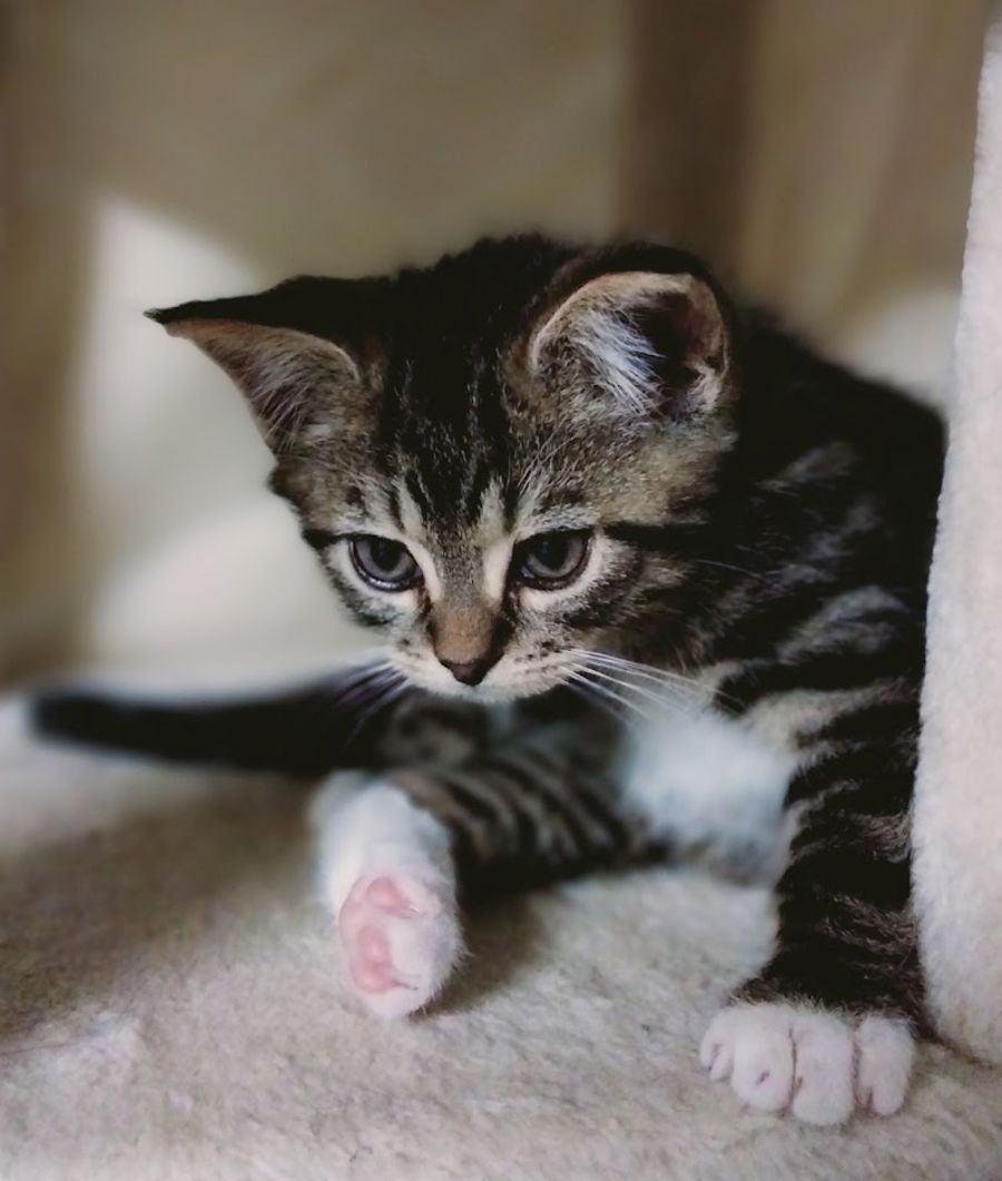 I’m Bunny and I’m a beautiful little tabby with white feet and little folded over ears. I got the name of Bunny when I was little ‘cause I hopped around like a rabbit. Now I’m much bigger and love running and playng and chasing my brothers and sisters. I’m ready for my ‘furever’ home now so please come and visit me. You won’t be disapointed.