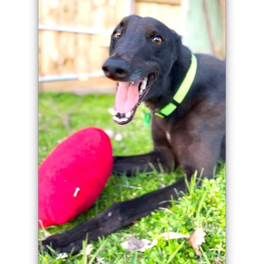 He is young, strong and big, so no small kids as he could easily knock them over or pull them down while on lead. We're looking for a greyhound experienced home for him where his new family understand his breed.