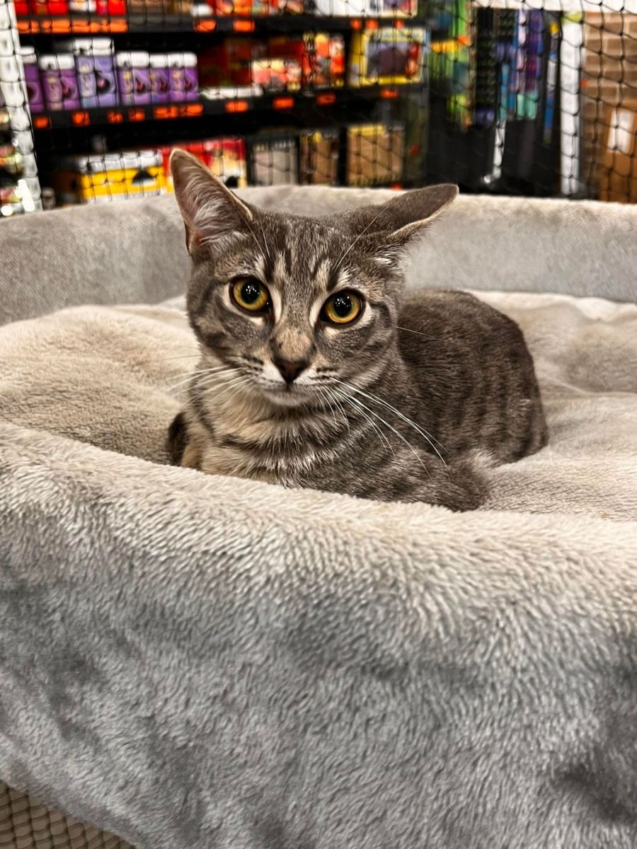 Beautiful slender sleek body. Lovely soft gray tabby coat. Just looking for someone to give her affection to . Could it be you?