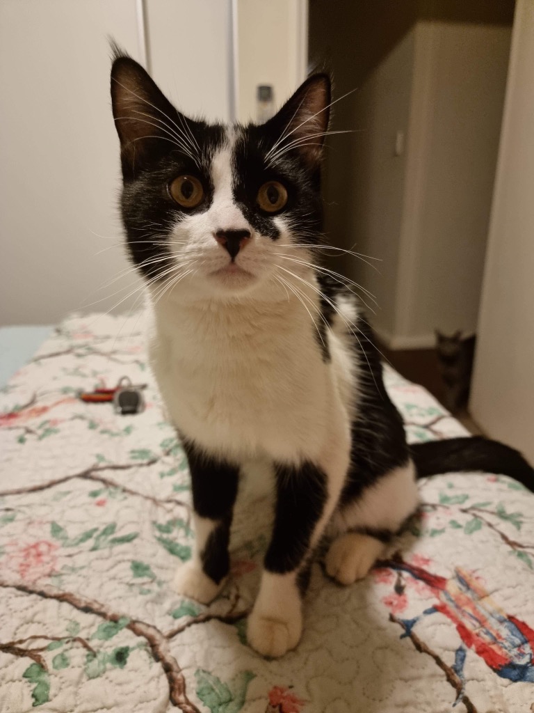 I'm a lovable goofball - very much kitten energy, cheeky and mischievous. Shy at first, then will fall for you hard and will be your shadow. Domino loves his cuddles and will give you smooches for days.