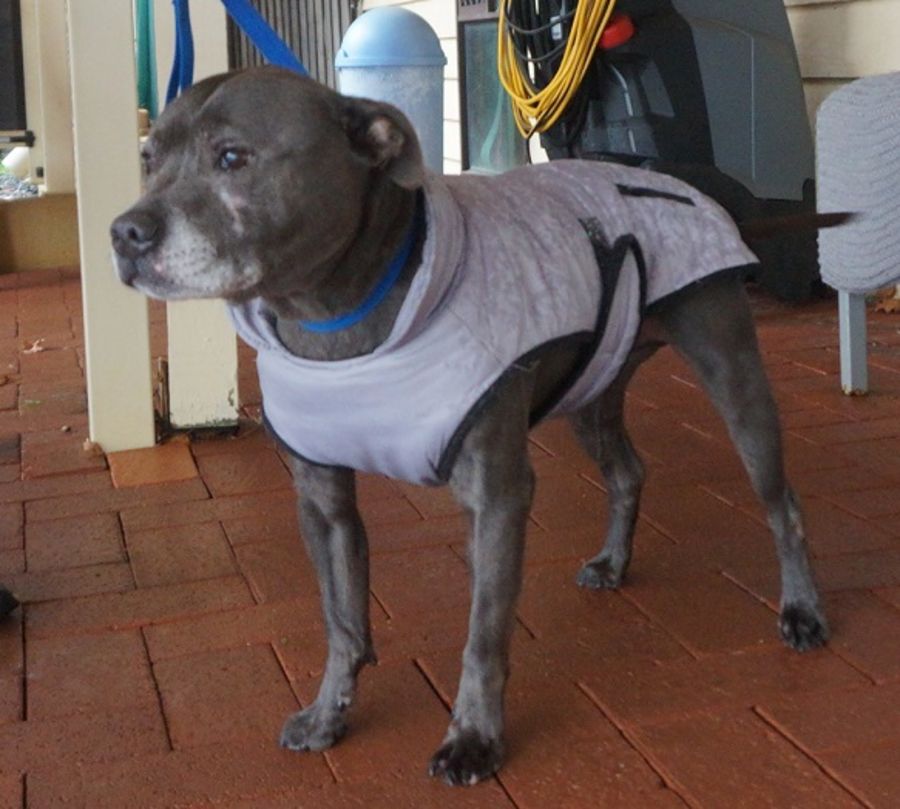 Banksy is a blue English Staffy - he may be 10 years of age but he is still a sprightly and strong dog. I wish someone would TELL him he is 10:)