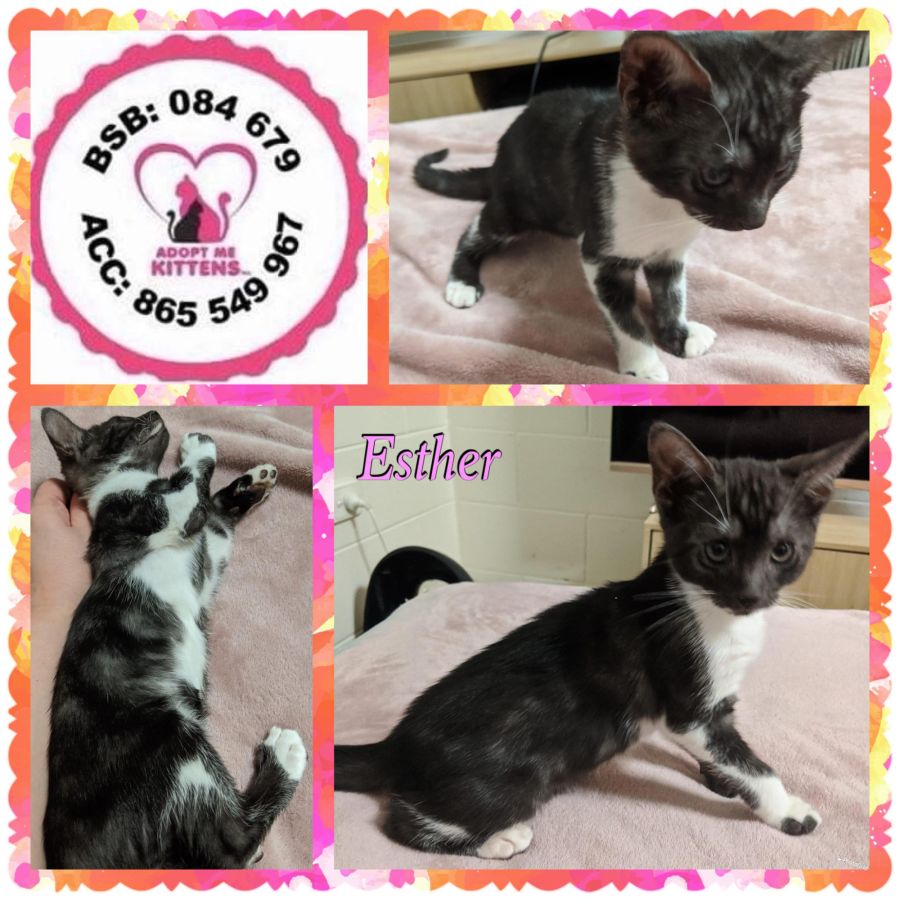 Esther is an extremely playful little girl. She loves play wrestle with other kittens, the laser, chasing balls and the cat tower. Esther loves a good chin rub and purrs in return. She's very hard to photograph as she's always on the go! Esther has been around a big dog and not bothered by it. She has the cutest little white moustache! A very entertaining girl.